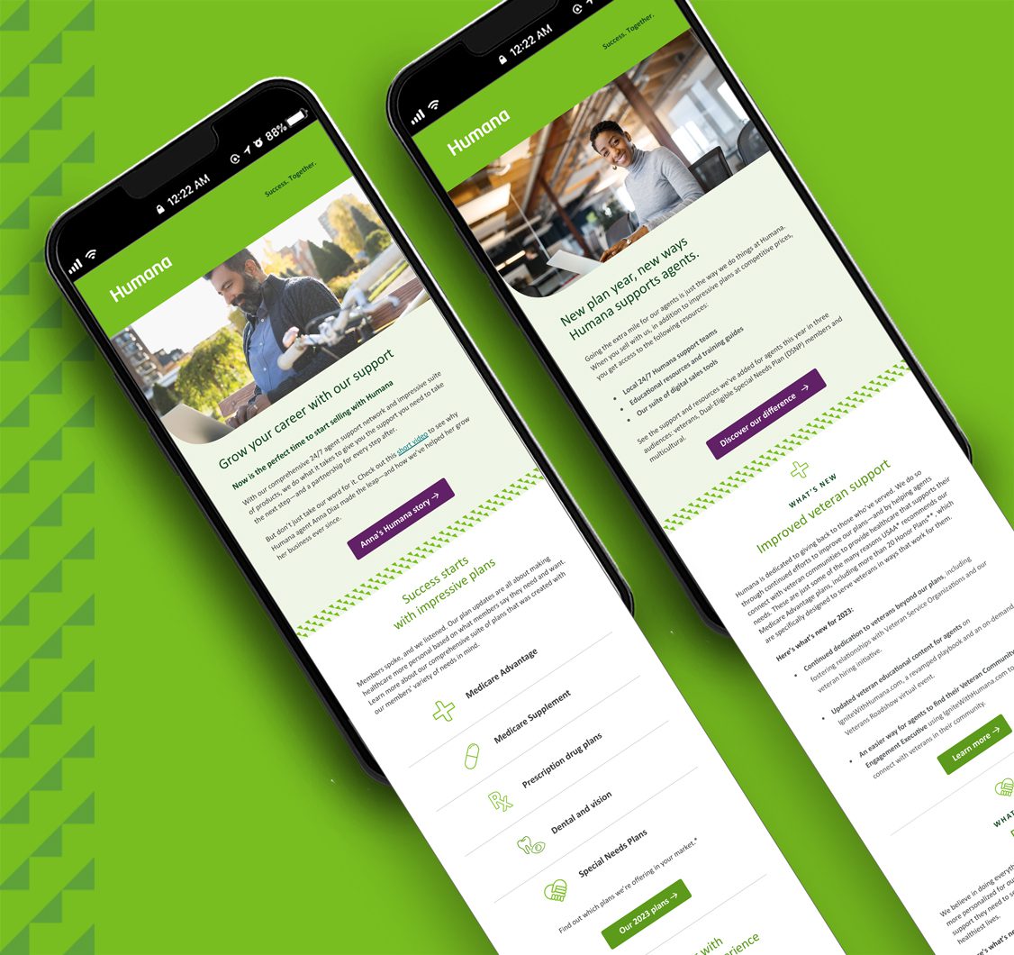 Using conversion-focused web experiences, educational content, video, email marketing, and targeted paid media campaigns, we wove the various pieces of this campaign together to create a beautiful tapestry. But more importantly, this work did more than just create something pleasing to look at, it gave Humana opportunities to grow in novel ways knowing that their agents have the support they need.